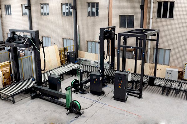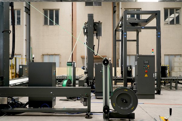 瓦楞紙板捆扎纏繞包裝線2臺頂壓式托盤穿劍捆扎機(jī)、1臺搖臂式纏繞包裝機(jī)以及若干滾筒輸送機(jī)組成。針對瓦楞紙板比較蓬松的特性,該線體配備了帶下壓功能的托盤捆扎機(jī),最大壓力可達(dá)500kg,有效降低包裝體積,同時讓包裝物更加緊實,防止運(yùn)輸過程中的散落。