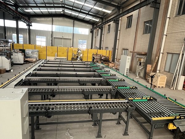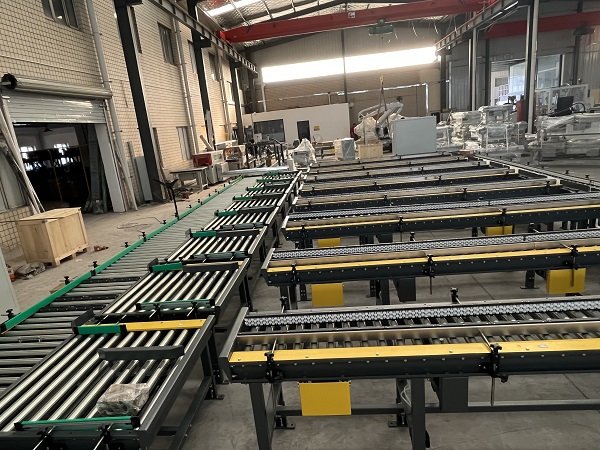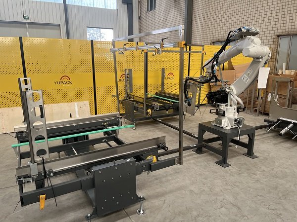 該線體主要功能是對(duì)卡丁車和賽車輪胎進(jìn)行裝箱和碼垛。線體最大亮點(diǎn)是,客戶一共有8條產(chǎn)線4種紙箱尺寸同時(shí)混產(chǎn),針對(duì)客戶的現(xiàn)實(shí)情況,艾訊采用了機(jī)器人+動(dòng)力料倉+自適應(yīng)折底封底機(jī)的結(jié)構(gòu),通過信號(hào)交互,來確定取哪款紙箱,開哪款紙箱,再通過信號(hào)識(shí)別,將紙箱輸送到指定的裝箱工位。同時(shí)該線體還配備了實(shí)時(shí)貼標(biāo)加在線打印功能,通過和上位機(jī)的實(shí)時(shí)通訊,來確定紙箱需要打印的標(biāo)簽內(nèi)容。